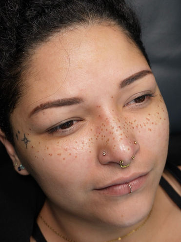 Hyper-realistic freckle tattoos are created using customized pigments where each freckle is perfectly placed to complement your features. Freckle tattoo services can be for those who have no natural freckles to begin with, or those who want to enhance their own existing freckles. They are 100% customizable to each client from the pigments used, placement, even beauty marks. The possibilities are truly endless and each client leaves with a unique face of freckles that will have people shocked when you tell them it's a tattoo.